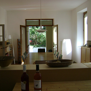 On the ground floor, the main changes that we made were to do away with the central corridor in order to increase the size of the sitting room; demolish the wall between the shop and the kitchen to form a large open dining room and kitchen; insert a new utility/bathroom behind the staircase and move the main entrance from the front of the house to the rear. The barn/garage at the rear of the house was turned into a terrace with access from the dining room and access to the garden through two new large openings. A store was constructed at one end of the terrace to house the central heating boiler, garden tools, bicycles, etc. The roof to the garlic drying shed at the side of the house was removed and the space is now a small garden with access through double doors from the ground floor sitting room.