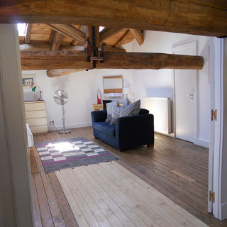 On the first floor the three bedrooms and the bathroom were retained and renovated (with a new access door to the bathroom from the main bedroom) and the barn at this level was converted into a large sitting room with large windows overlooking the garden and the country beyond. This room is nearly seven metres high on one side (all of the roof timbers are exposed), and has a new, hidden staircase at one end leading up to the second floor.