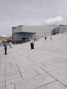 At ground level, the roof/plaza is very wide and it must be windswept and very uninviting during bad weather and I was very disappointed to see that it did not actually slope down into the water as it stops short with a flat platform at the bottom and a barrier in front of the waterside! It is however very popular with visitors and was being used by a large number of people while we were there. The actual Opera House and its ancillary accommodation is also very large and apart from the roof, from the exterior the building is not that interesting from an architectural point of view. Unfortunately we were not able to get into the performance space which has had very good reviews.